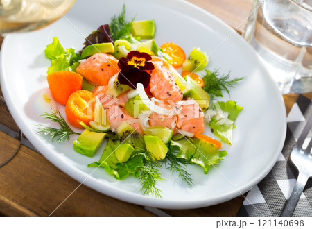 Ceviche from salmon with avocado, cumquat and green dill at plate with flower