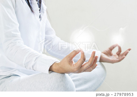 Close up of woman meditating sitting in room