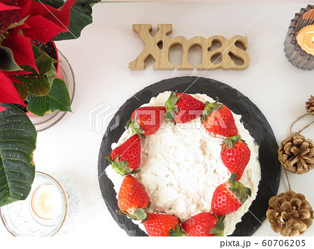 クリスマスデコレーション: 苺のケーキとキャンドルとポインセチア