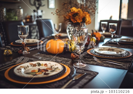 Seasonal table setting with pumpkins and flowers