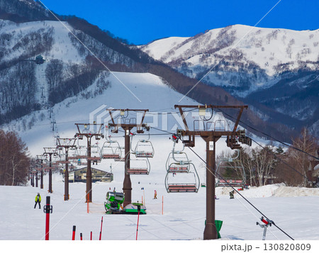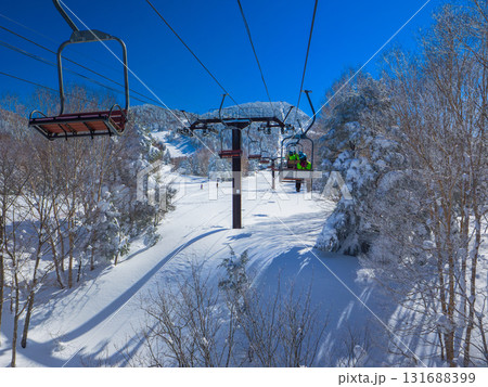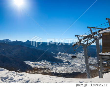 青空の下でリフトに乗りながら眺める冬のスキー場の眺望 (長野県、志賀高原、横手山)