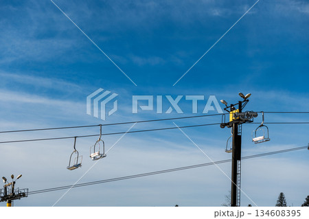 Empty ski chairlifts hanging against a bright, wispy blue sky on a clear day. Ready for winter sports and mountain adventures. Metal ski lift chairs and cable lines stretch across a vibrant blue sky
