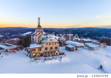Tanvaldsky Spicak Ski Resort shows the lookout tower surrounded by snow. People enjoy winter activities as the sun sets over the mountains in Czechia. The resort has several buildings and chairlifts.