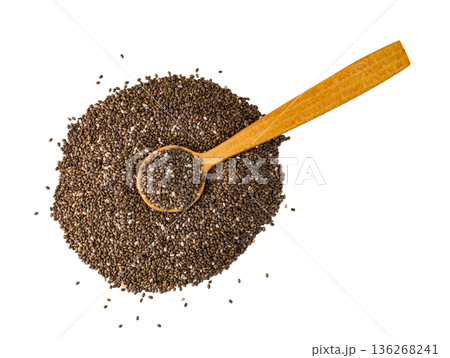 Heap of Chia seeds with wooden spoon. Healthy superfood rich in Omega 3 fatty acids. Dry healthy natural ingredient. Chia grains are falling