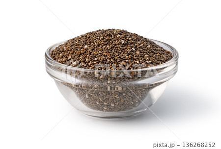 Chia seeds in glass jar. Healthy superfood rich in Omega 3 fatty acids. Dry healthy natural ingredient. Chia grains are falling