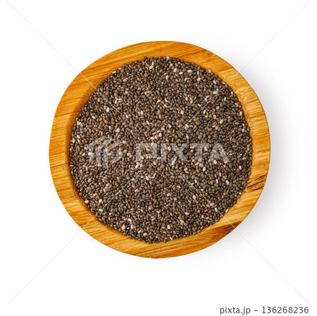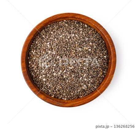 Chia seeds filling wooden bowl, offering healthy nutrition