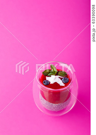 Healthy yogurt or smoothie with chia seeds, vegetarian food, diet and health concept