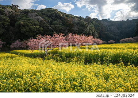 千葉県旭市 岩井の堰 河津桜と菜の花