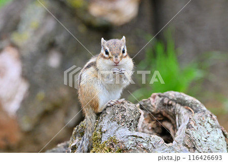 倒木お上で立ち止まる頬袋を膨らませたエゾシマリス