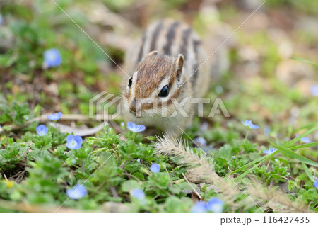 シマリスとオオイヌノフグリ 埼玉県さいたま市(市民の森・見沼グリーンセンター・りすの家)