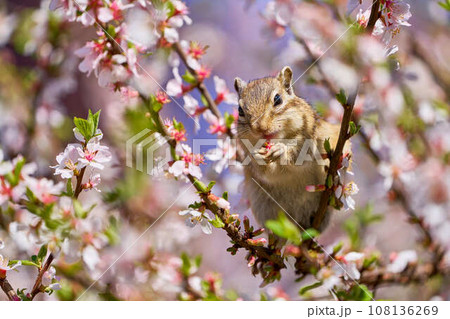 ユスラウメの花を食べるシマリスのアップ 春の素材