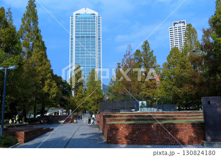 神戸市の東遊園地に設けられた「慰霊と復興のモニュメント」の一角と、神戸市役所1号館(高層ビル)