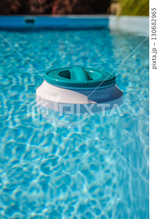 Floating chlorine dispenser drifting in clear blue pool water, used for regular maintenance and water disinfection