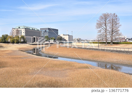 淀川河川敷風景 冬枯れの樹林 大阪府高槻市