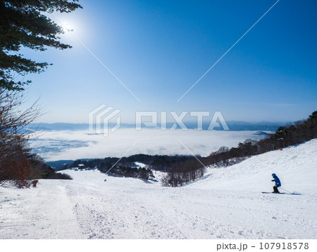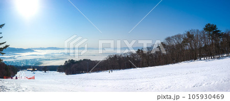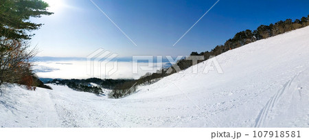 [パノラマ] 雲海に覆われた町と湖を望む朝の静かなスキー場 (福島県、猪苗代スキー場)