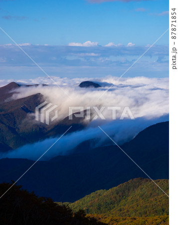 秋の高原とその背後に雲海のかかる山々 (中央高原、鳥兜山、山形県))