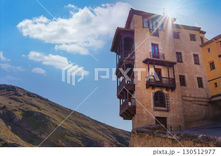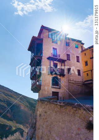Hanging houses of cuenca shining under the sunlight with blue sky
