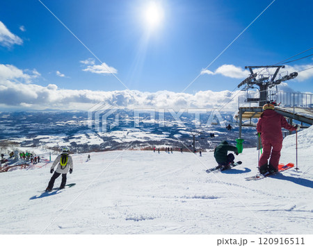 快晴のスキー場と麓に集まる人々 (北海道、ニセコ)