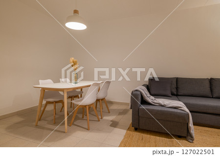 Side angle of dining area with white table and four chairs placed beside the living room and sofa