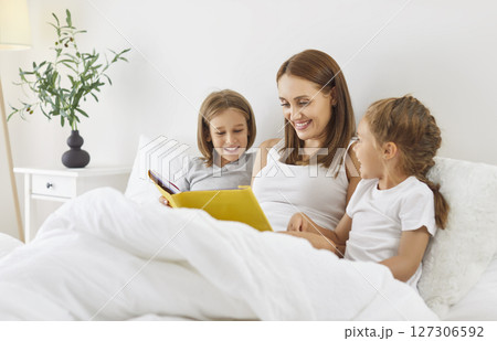 Mother Reading A Book With Children In Bed During Leisure Time At Home