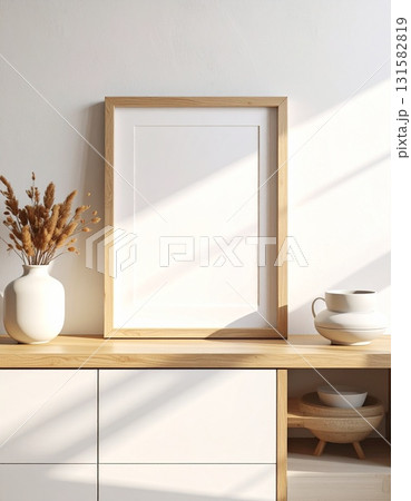 モダンリビングの棚に置かれたフォトフレーム|シンプルインテリアモックアップ