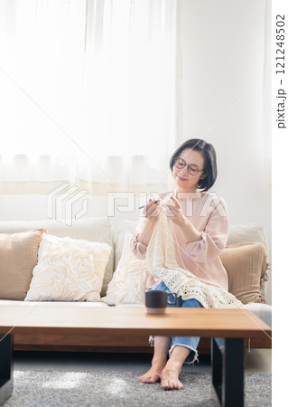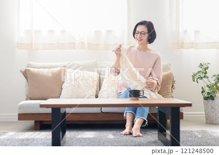 リビングで編み物をするミドル女性