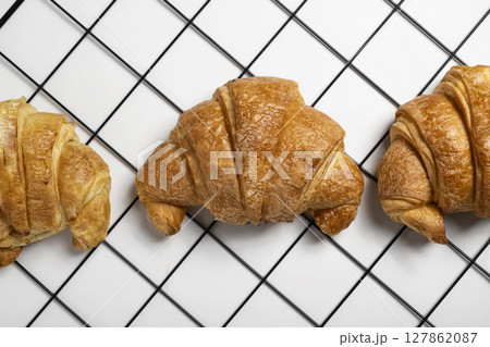 Freshly baked croissants on a cooling tray with a white background. Top view