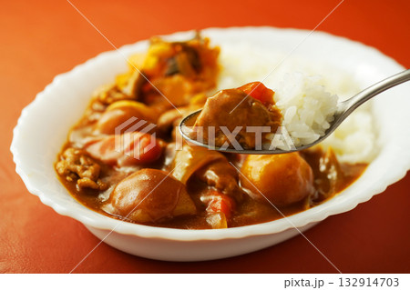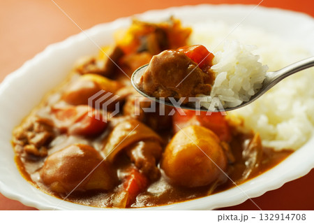 カレーライス ポークカレー 白テーブル スプーン