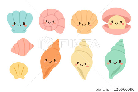 Cute illustrated sea shells with happy faces in soft colors, great for children designs, beach themes, and kawaii-style shell graphics