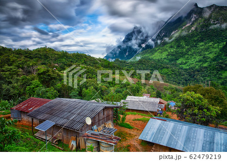 Landscape of country house and mountains in the fog at Doi Luang Chiang Dao,Chiang Mai,Thailand
