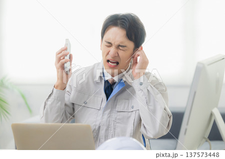 会社でクレーム対応する作業着の男性