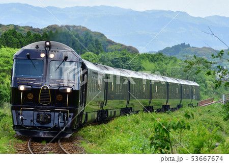 久大線の山中を行く、豪華寝台列車 ななつ星in九州