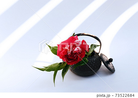 モノトーンを背景に光の縞模様と椿の赤