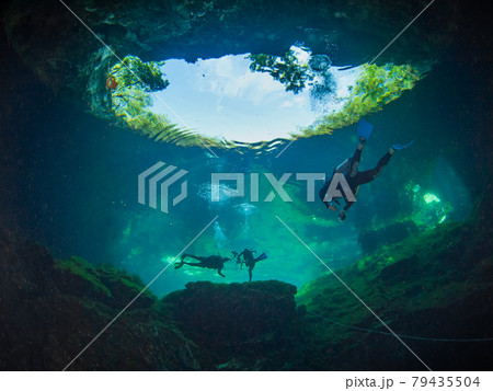 セノーテ(水中洞窟)を出るスクーバダイバー達 (プラヤ・デル・カルメン、メキシコ)