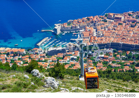 Old town of Dubrovnik with cable car ascending Srt mountain, Croatia