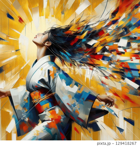 Abstract Portrait of a Woman in Traditional Kimono with Flowing Hair and Colorful Brushstrokes on Golden Background with Generative AI.