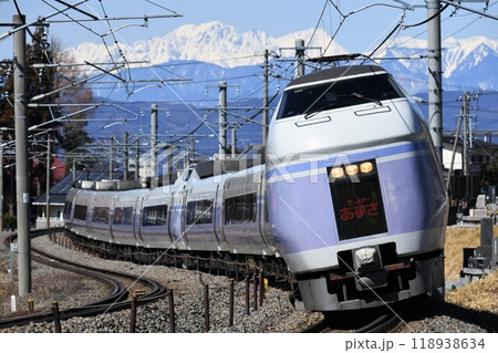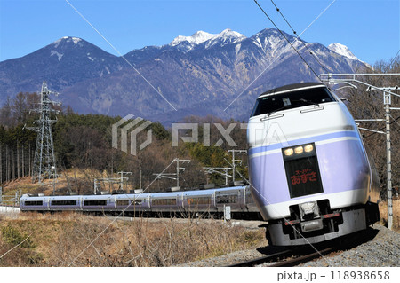 雪残る八ヶ岳をバックに疾走する上りスーパーあずさE351型