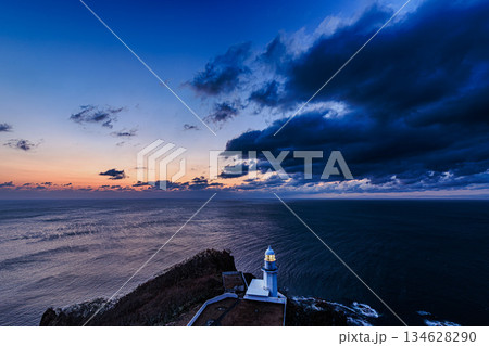 黎明の地球岬 断崖に立つ灯台と広がる海