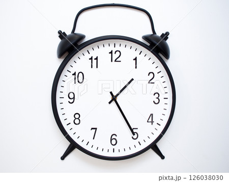 Black Retro Alarm Clock Showing 03:30 or 15:30. Classic Bell Style on White Wood Background.
