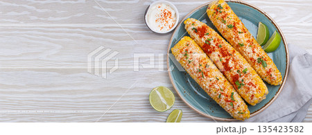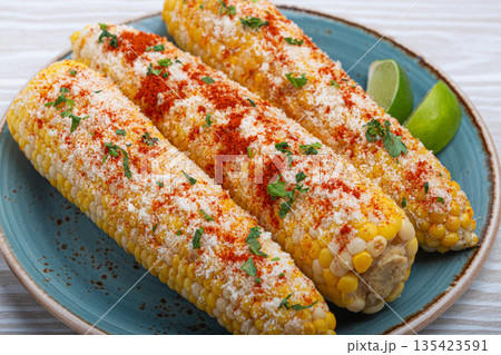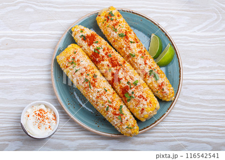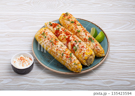 Delicious Mexican dish Elotes corn cob covered in spices and cheese