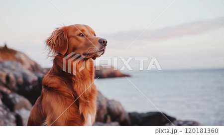 A golden retriever sits on a rocky shore, gazing at the vast ocean in the evening