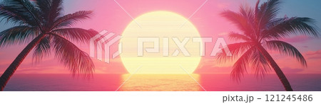 マジックアワーの沈む太陽と海岸の風景のイラスト