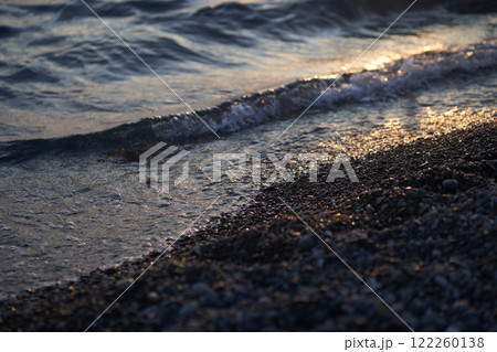 Water reaching the shore of a pebble beach in the afternoon sun. With space to copy. High quality photo
