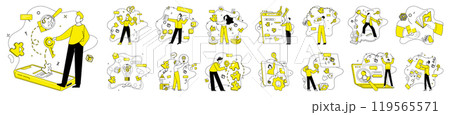 Customer Engagement set. Illustrating user experience, content recommendation, and target audience strategies. Characters interact with digital content achieving business goals. Vector illustration.