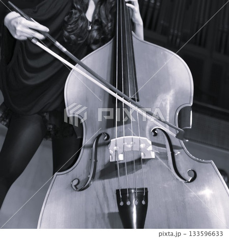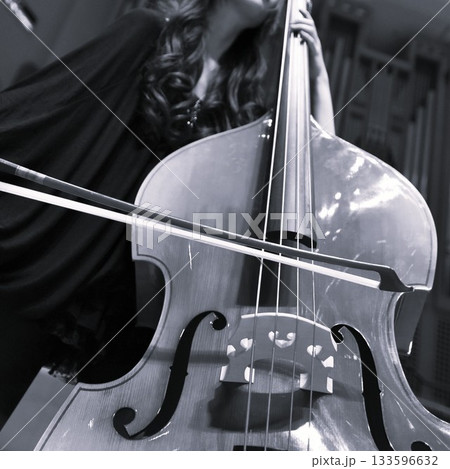 弦楽器のコントラバスを弾き、奏でる女性