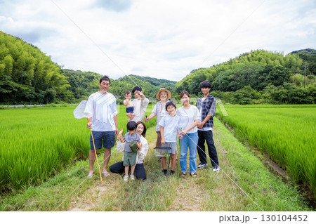 夏休み帰省した故郷でみんなで遊ぶ 家族仲間の集合写真