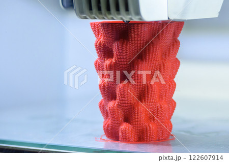 3D printed art object. Art object printed on 3D printer from melted colored plastic. Model in shape vase created on 3D printer from threads of molten plastic. Modern additive progressive technologies