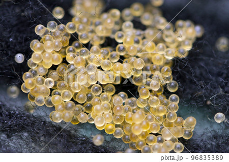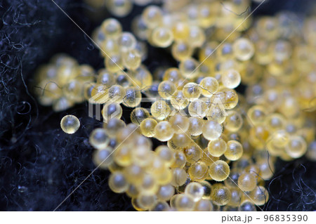 黒い繊維でできた人工産卵床に産み付けられた観賞用ヒカリメダカの魚卵をマクロ接写撮影。
