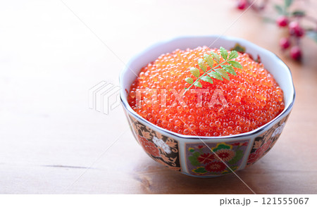 茶碗に盛ったいくらの醬油漬けのクローズアップ