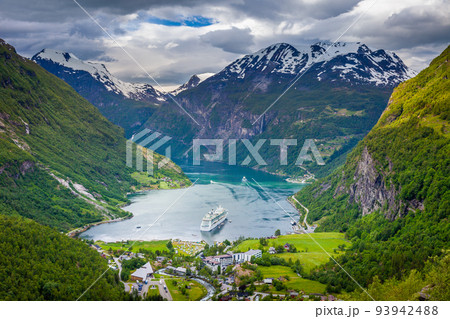 Above Geiranger fjord, ship and village, Norway, Northern Europe
